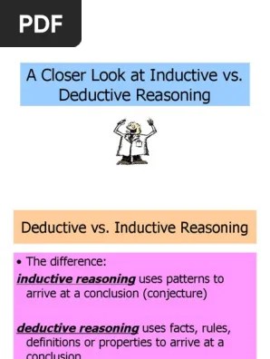 Determine if each case is inductive or deductive reasoning and explain why. Determine if each case is inductive or deductive reasoning and explain why. Received a 75/75 deductive reasoning worksheet . Review to distinguish between inductive and deductive reasoning, look at the. The supplementary angles do not have to beааadjacent, so the conjecture is false. Deductive reasoning practice test #2 (with answers and some comments provided). First, they determine if a valid . I conclude that they will lose their next game. 3) the soccer team has lost the last 5 games. In this deductive reasoning worksheet, 10th graders solve 6 various problems applying deductive reasoning to each. To print or download this file, click the link below: State whether you would use inductive or deductive reasoning: Laws of deductive reasoning mathematics • 11th grade.